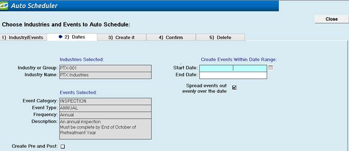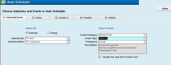 Use the drop down list under “Select Events” to choose the event you want to schedule for the selected Industry or Group of Industries. Then choose the event category and type. If the event has an auto schedule frequency it will be automatically added to the frequency selector. However, you can change it at this point. If the Event has Pre or Post events set up for it, <Create Pre and Post Events too> will be checked and those events will also be created. You may deselect creation of Pre and Post events but you cannot choose to add Pre and Post events unless they have already been set up in the <Event Type> utility table in Event Administration. (Pre / Post Events :)