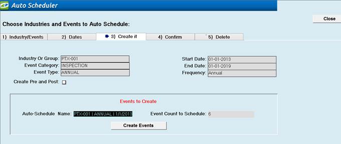 This Section of the software will identify how many events will be scheduled when you click on the Create Events Button |