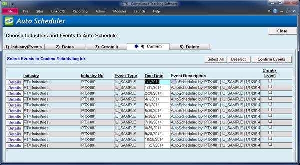 Choose the event that you would like to create, and then click on the Confirm Events button to create the events. Users can use the "select all" and "deselect all" to quickly choose events. |