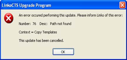 If Linko cannot locate the shared files while attempting to install a patch, the following error will be generated. This error indicates that the TempReport.csv file was corrupted, moved to a new location or deleted.