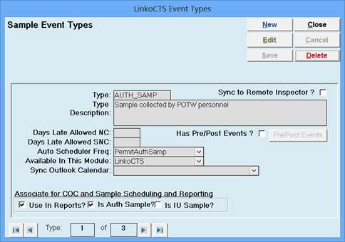 Go to Event Administration and click on the Samples tab. Check to make sure that all the Sample Types you use in your program are listed under the Samples tab. If necessary, add new Sample types to the list by clicking on the Add New selection.
