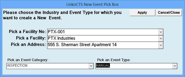 Opens the create New Event Pick box to create a new event for the selected industry. Users can select an event category and type for the event. NOTE: Only on Add New can a user create Pre and Post Notification Events. |