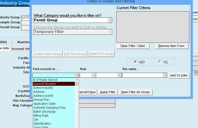 Now that you have Criteria in the “Current Filter Criteria” you can either apply the filter to Industry Groups screen or Save it. Applying the filter criteria does not save it, but it will apply it to the screen. Using the Apply feature to review the information that has been filtered on permits you to see if you want to save the filter as a Group. If you get the results that you want from the filter you can click on the Groups/Filter button again and save the Filter. |