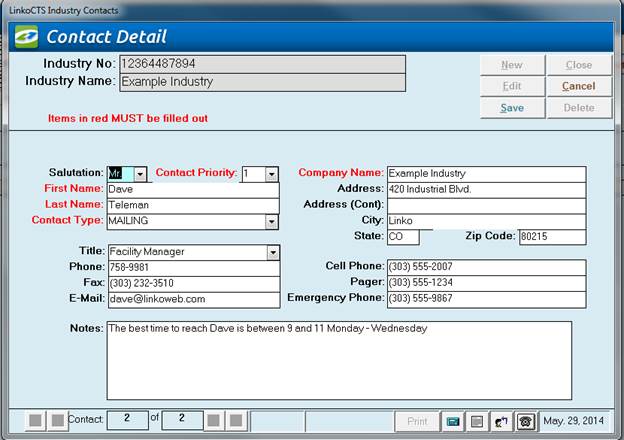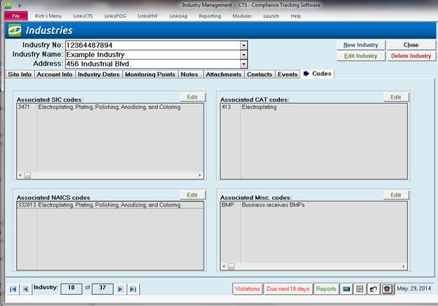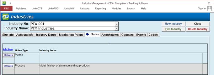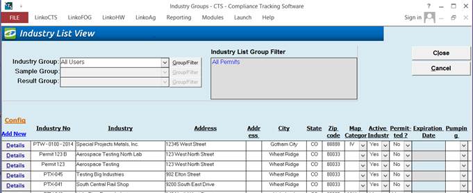 Industry List View provides sorting, grouping, and reporting on the Industries you select with the fields you configure. As of Version 10.1 of the LinkoCTS SQL version, this list view is User Modifiable in the “white” fields. The “grey” fields remain locked and cannot be updated by the Users. The information changed here will be shown in the Industry Management screens.