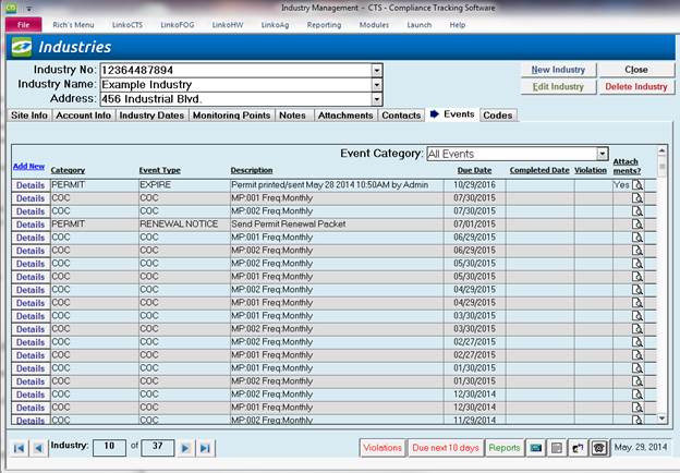 Opens appropriate Edit Event window for selected Event: COC, Generic Event, Inspection Event, Permit Event, Sample Event, and Violation |