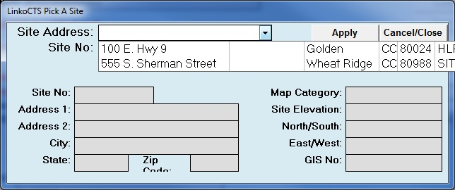 Combo box allowing user to select a Site for display. Sorted by street address |