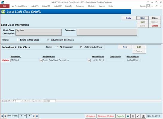 From Industry Management choose an Industry of interest. Select the Monitoring Points Tab and click on the View Local Limits Button. This opens the Local Limit Class Details screen while showing one of two Indicator messages about that Industry and any related Local Limits. If that Industry has been assigned to one or more Local Limit Classes, the Indicator message displays the latest Local Limit Effective Date for that Industry.
