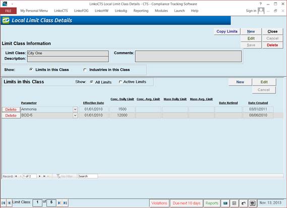 Local Limit Classes provide greater flexibility for the POTW to manage the Parameter local limits that apply to Industrial Users. Local Limit classes allow you to create multiple sets of local limits. You can create one class of Local Limits that apply to all Industries or you can create multiple classes of Local Limits and assign Industries to a particular class.