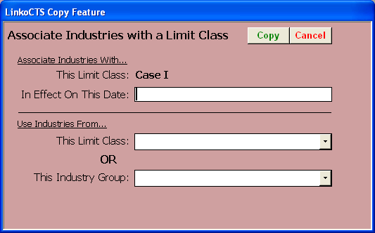 Copy Industries from another Limit Class or an Industry Group into a new Limit Class. The user can also associate Industries from an existing Limit Class to the same Limit Class but assign new effective dates for the Industries.