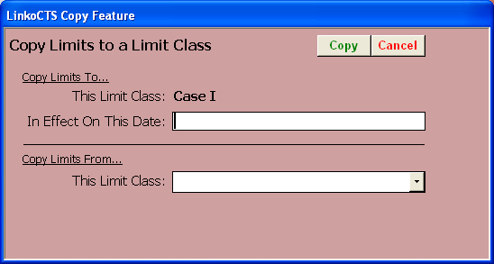 Select one of the other Limit Classes to copy all the Parameters from that Limit Class to this one. All limits in effect for the class selected here are copied into the Limit Class above. The user is prompted for a new effective date. The user can then edit the copied limits as needed. |