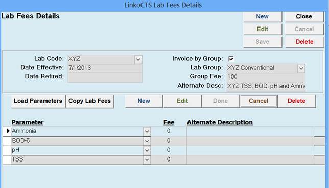 Click to add a new or edit an existing Parameter listed in the Lab Fee. |