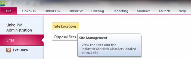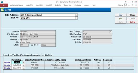 Create one site to be used with several Industries / Facilities / Permits. Access Sites from the File menu: