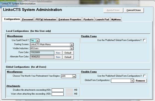 The use of Local Configurations and Global Configurations allows your POTW to create standardized screen setups for all users or allow individual setups. One possible scenario would be the Linko System Administrator using the Global Setting to force everyone on LinkoCTS to have a standard setup. Then later, the Admin could turn off the Global Settings and allow certain users to configure their own screens.